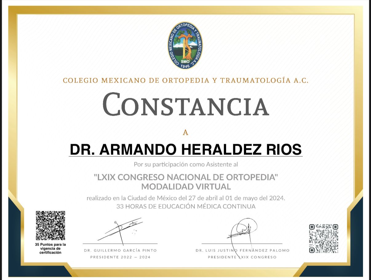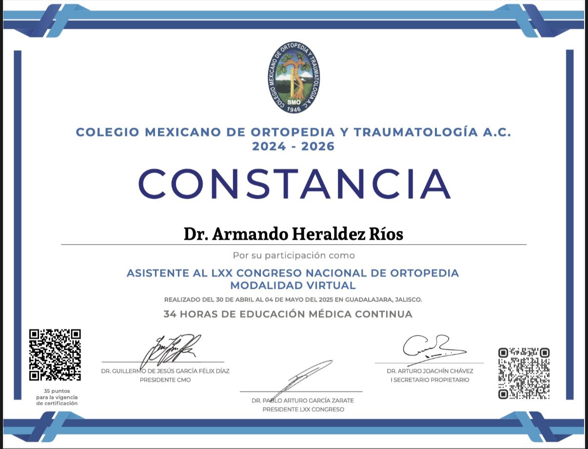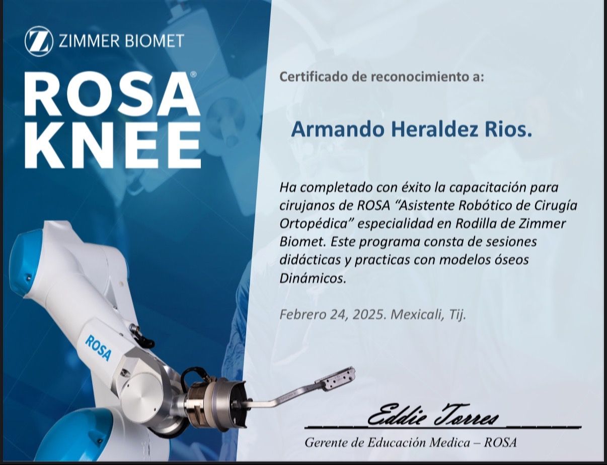 Soy el Dr. Armando Heraldez Ríos, Médico Ortopedista y Traumatólogo en la ciudad de Mexicali. Certificado por el consejo mexicano de ortopedia y traumatología Mi vocación es ayudar a mis pacientes a recuperar su movilidad, aliviar su dolor y mejorar su calidad de vida. Cuento con amplia experiencia en artroscopia de rodilla, prótesis de cadera, prótesis de rodilla , fracturas , lesiones deportivas. Brindo tratamientos personalizados para lograr una rehabilitación segura y efectiva. Cada paciente es único, por eso mi compromiso es escuchar, explicar con claridad y acompañar en cada paso del proceso, desde el diagnóstico hasta la recuperación. Mi objetivo es que vuelvas a hacer lo que amas: caminar, moverte, disfrutar de tus actividades y sentirte libre nuevamente. En mi consulta encontrarás trato humano, atención de calidad y soluciones médicas respaldadas por la más alta preparación profesional. Porque tu salud y tu movilidad son mi prioridad, trabajaré contigo para que no solo recuperes movimiento, sino también tu calidad de vida
